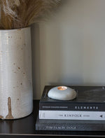 Each stone is cut on the bottom to create a flat spot, and ground to remove sharp edges. They are then drilled twice which allows us to make a perfectly sized countersink to accept a standard sized tealight candle slightly inset into the stone.